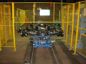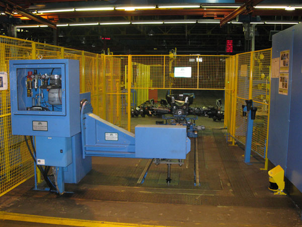 A motorised shuttle car retrieves the assembled unit and returns to the load point, where it is transferred to the main tractor chassis assembly line. The shuttle features adaptive support points and powered jacking units to accommodate the full range of axle variants.
